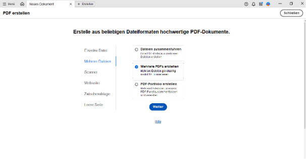 - Wähle „Mehrere Dateien“ und „Mehrere PDFs erstellen“ und klicke auf „Weiter“.
