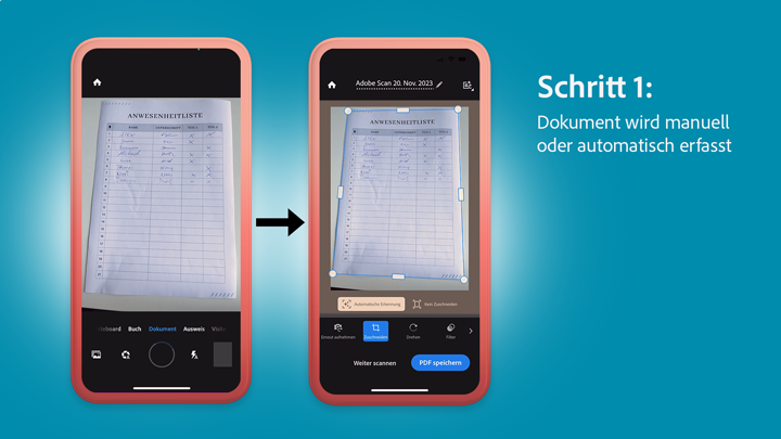 Mit der kostenlosen Adobe Scan App kannst du Dokumente ganz einfach einscannen und in PDF oder JPEG konvertieren. Verwende die Scan App zum Beispiel, um Dokumente, Formulare, Whiteboards, Quittungen oder auch Visitenkarten in qualitativ hochwertige PDF-Dateien umzuwandeln.