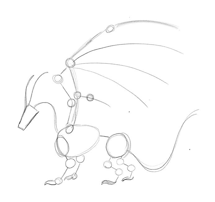 Sobald du entschieden hast, an welchen Tieren du dich orientieren möchtest, stelle die ungefähre Form deines Drachen mit einfachen Linien und Grundformen dar. Du brauchst noch nicht ins Detail zu gehen – eine Skizze reicht. Konzentriere dich zunächst nur darauf, Proportionen und Pose deines Drachen zu definieren. Gebogene Linien bieten sich an, um die schlangenartige Natur des Drachen abzubilden.