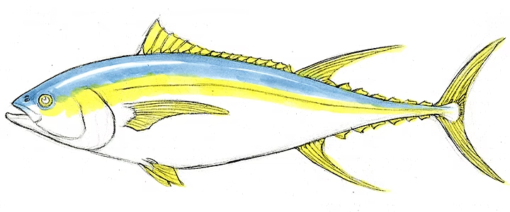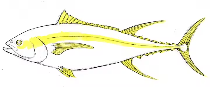 Thunfische haben zwischen der zweiten Rückenflosse und der Schwanzflosse mehrere kleine dreieckige Flössel, die man nicht vergessen darf. Zeichne zum Schluss die Schwanzflosse. Sie ist wie ein Halbmond geformt und hat symmetrische Lappen.