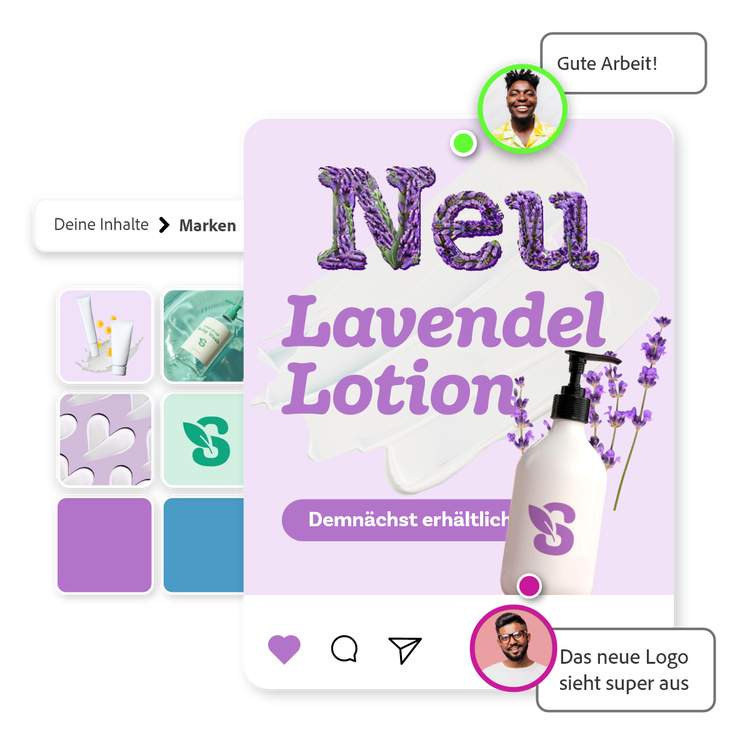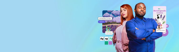 Erstellt im Team markenkonformen Content mit zuverlässigen Kreativ-Tools. Wählt aus unzähligen Vorlagen, Schriften und Stockmedien – direkt im Programm. Und nutzt die Power generativer KI, speziell für den kommerziellen Einsatz entwickelt.