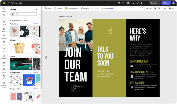Erstelle mit Adobe Express, der App zum schnellen und einfachen Erstellen von Content aller Art, wunderschöne Pamphlete, die die Aufmerksamkeit deiner Zielgruppe fesseln. Beginne mit einer Vorlage und füge dann deinen Text und deine Grafiken hinzu, ohne dass du dich um die mühsame Layoutformatierung kümmern musst. Keine Design-Kenntnisse erforderlich.