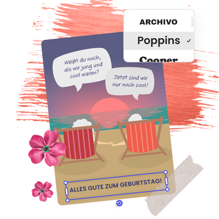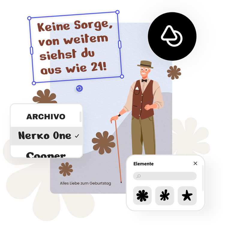 Es gibt zahllose Möglichkeiten, deine lustige Geburtstagskarte zu gestalten. Durchstöbere unsere Vorlagen-Bibliothek und lasse dich inspirieren. Probiere lustige Sprüche in verschiedenen Schriftarten aus oder ergänze witzige Tiergrafiken oder Designelemente wie Luftballons, Kerzen oder Tortenabbildungen. Adobe Express liefert dir zahlreiche Optionen, mit denen du deine lustige Geburtstagskarte kostenlos erstellen und individualisieren kannst.