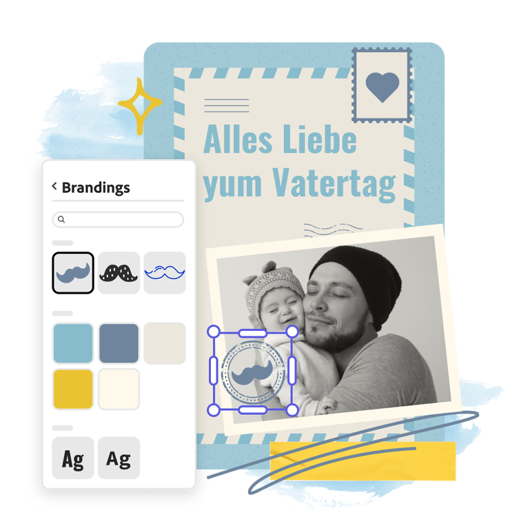 Ob du deine Grüße zum Herrentag lustig, elegant oder seriös gestaltest, liegt ganz bei dir. Mit Adobe Express kannst du deine Karte zum Männertag so gestalten, wie es dir gefällt oder wie es am besten zu dem Empfänger passt. Wähle aus den vielen Vorlagen und Formaten ein passendes Template aus. Das leicht bedienbare Kreativ-Tool gibt dir eine Reihe von Auswahlmöglichkeiten, mit denen du mit verschiedenen Hintergründen, Farben, Layouts und anderen Designelementen experimentieren kannst. Oder lade eigene Bilder und Grafiken hoch, um deine Männertag-Karte noch persönlicher wirken zu lassen.