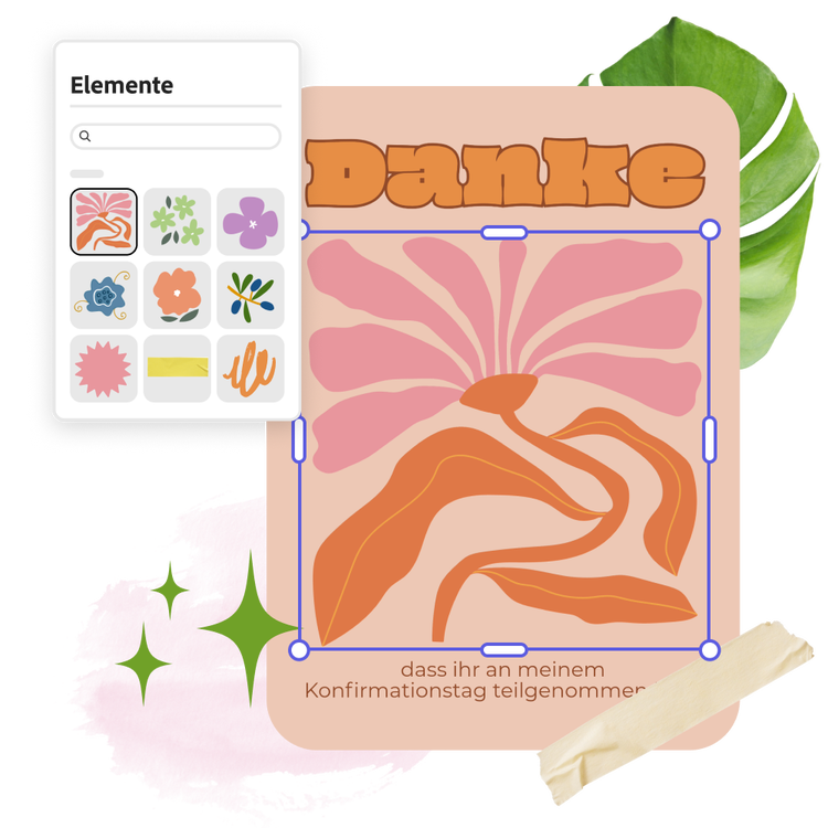 Ob klassisch-traditionell oder lustig und modern: Gestalte deine Dankeskarte individuell nach deinen Vorstellungen. Ob du in deiner Danksagung also ein passendes Bibelzitat oder einen frechen Spruch einbaust, bleibt ganz dir überlassen. Bei Adobe Express stehen dir verschiedene Schriftarten, Farbpaletten und Designs zur Verfügung, um deine Dankeskarte zu personalisieren. Was sich außerdem immer gut macht: Fotos des Konfirmanden oder der Konfirmandin am Tag der Feier.
