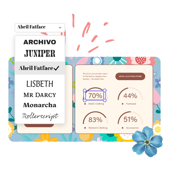 Präsentiere deine Daten auf möglichst visuell ansprechende Weise. Wenn du ein Adobe Express Premium-Abo hast, kannst du dein vorkonfiguriertes Branding mit einem Klick auf dein Messdiagramm anwenden. Dein Messdiagramm wird augenblicklich an die Farbdesigns, Logos und Schriften deines Brandings angepasst. Jetzt kannst du deine Daten ganz einfach und formvollendet mit anderen teilen.
