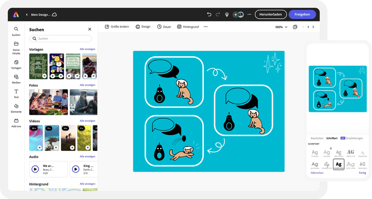 Mit den exklusiven Designelementen von Adobe Express kannst du deinen Projekten ganz einfach mehr Flair und Individualität verleihen. Verwende mit nur einem Fingertipp eine Textanimation für kurze Grafikvideos. Wir haben uns um alle technischen Dinge gekümmert, damit du dich ganz auf deine Botschaft und deinen Stil konzentrieren kannst. Darüber hinaus kannst du deinem Projekt weitere Personen hinzufügen, damit ihr gemeinsam Ideen austauschen könnt.Ändere die Größe, damit deine Inhalte mehr Reichweite erzielen.