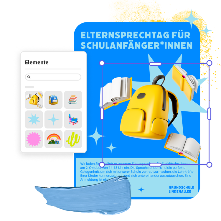 Für deine Einladung zum Elternabend stehen dir in der Vorlagen-Bibliothek eine große Auswahl an Mustern zur Verfügung. Diese kannst du ganz nach deinen Vorstellungen anpassen: Adobe Express führt dich Schritt für Schritt durch den Designprozess und bietet dir eine Reihe von Auswahlmöglichkeiten für Schriftarten, Farben und Hintergründe, mit denen du dein Design ganz leicht personalisieren kannst. Füge das Logo der Einrichtung oder andere eigene Grafiken und Bilder hinzu oder nutze Icons, Designelemente, Effekte und sogar Stockbilder, damit deine Einladung zum Elternabend mit wenig Aufwand gut aussieht. Designkenntnisse sind nicht nötig.