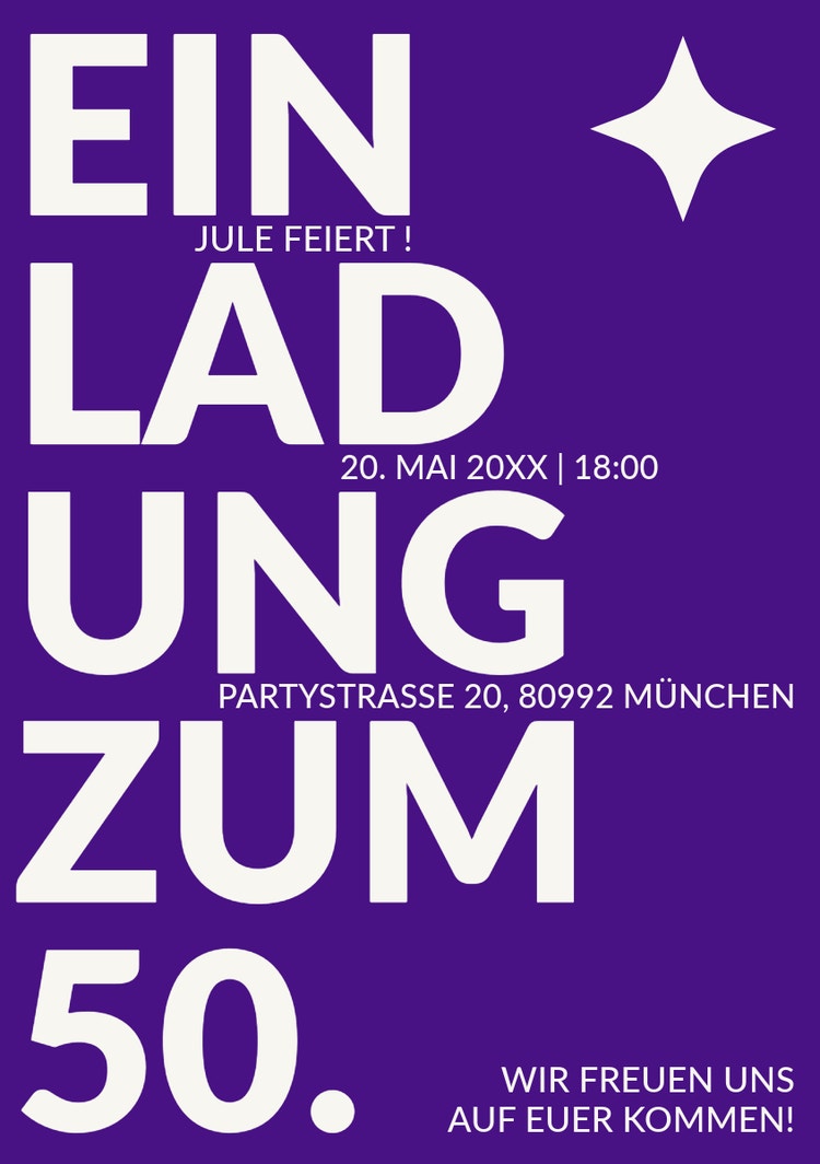 Ganz gleich, aus welchem Grund du eine Party veranstaltest, die Gestaltung deiner druckbaren Partyeinladungen gelingt schnell und einfach. Mit den Vorlagen von Adobe Express kreierst du Partyeinladungen für jeden Anlass ganz intuitiv – womit die Vorfreude auf die Fete steigt! Ein besonders einfacher Designprozess ermöglicht es dir, deine Einladungen individuell zu erstellen, auch ohne Designvorkenntnisse. Alles, was du benötigst, ist deine Fantasie.