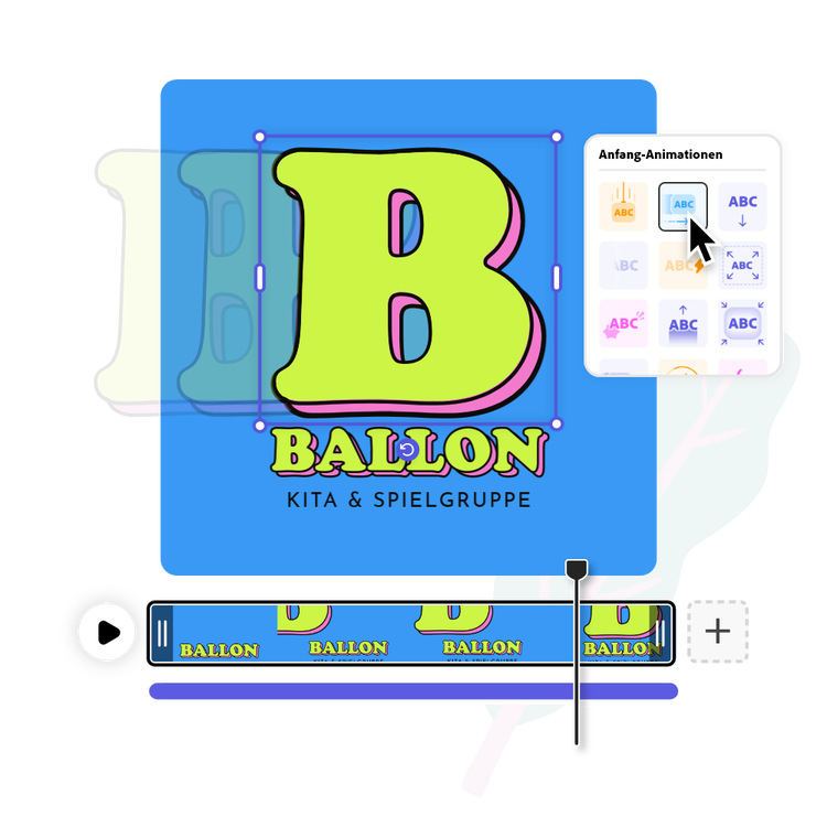 Personalisiere des Weiteren dein Logo in deinem Adobe Express-Arbeitsbereich. Wähle aus Dutzenden von Animationsarten, die du auf den Text oder die Bilder in deinem Kreislogo anwenden kannst. Lade dann dein animiertes Kreislogo als MP4-Datei herunter, um es in Video-Intros, Clips für soziale Medien und sogar in deinem Blog oder auf deiner Website zu verwenden.