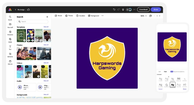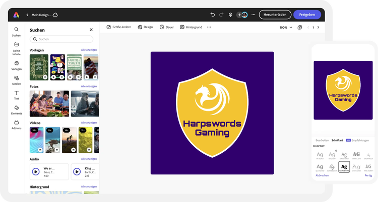 Bearbeite dein Gaming Logo in deinem Adobe Express-Arbeitsbereich weiter. Wähle aus Dutzenden von Animationsstilen, die du für den Text oder die Bilder in deinem Logo verwenden kannst. Lade dein animiertes Logo dann als MP4-Datei herunter, um es in Video-Intros, Streams, und mehr zu präsentieren.