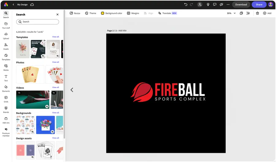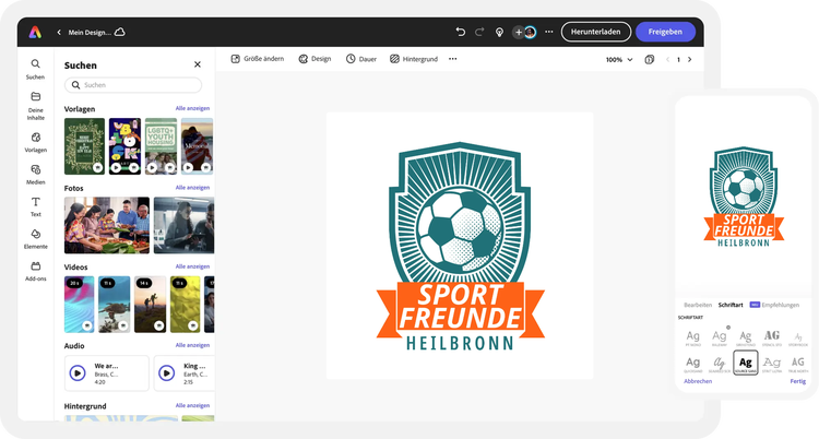 Wenn du fertig bist, kannst du hochwertige PNG- und JPG-Dateien deines neuen Text-Logos herunterladen. Lade dein Logo in den Bereich „Marken“ in Adobe Express hoch, um es direkt für zukünftige Designs anzuwenden. Verwende dein Logo auf Flyern, Visitenkarten, Werbeartikeln, Marketingmaterialien, sozialen Medien und allem, was du dir sonst noch vorstellen kannst.