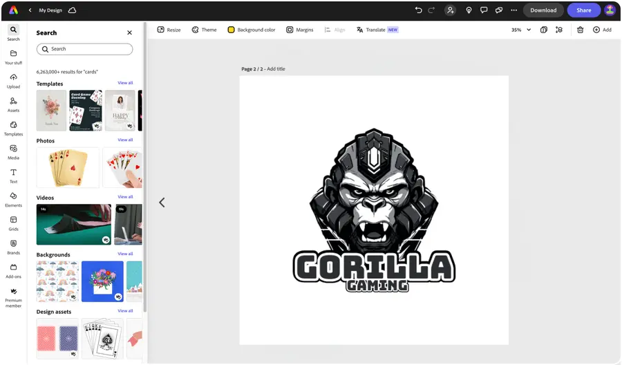 Wenn du fertig bist, lade hochwertige PNG- und JPG-Dateien deines neuen Twitch-Logos herunter. Lade dein Logo im Margen-Bereich von Adobe Express hoch, um es direkt für zukünftige Designs zu verwenden. Zeige dein Logo auf deinem Stream, deinem Twitch-Profil, deinen Social-Media-Plattformen, YouTube-Videos und mehr.