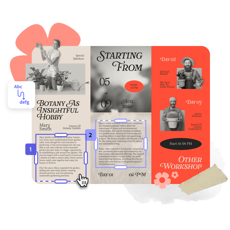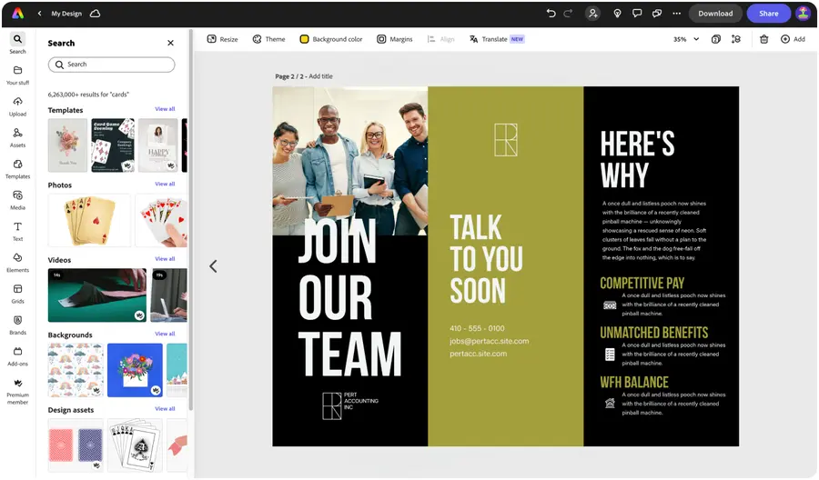 Wähle als Ausgangspunkt eine von zahlreichen schönen Vorlagen, um dein Pamphlet zum Leben zu erwecken. Du kannst auch deine eigene PDF-Datei importieren, wenn du bereits über einen Pamphletentwurf verfügst, den du in Adobe Express weiter anpassen möchtest.Mit Bildern und Text individuell gestalten.