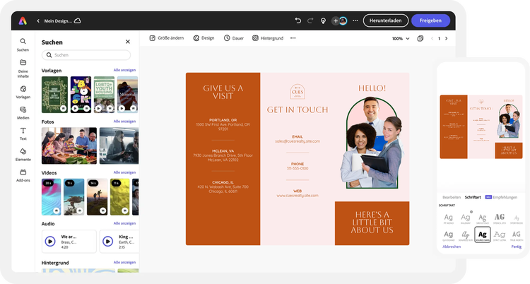 Erstelle mit Adobe Express, der App zum schnellen und einfachen Erstellen von Content aller Art, wunderschöne Pamphlete, die die Aufmerksamkeit deiner Zielgruppe fesseln. Beginne mit einer Vorlage und füge dann deinen Text und deine Grafiken hinzu, ohne dass du dich um die mühsame Layoutformatierung kümmern musst. Keine Design-Kenntnisse erforderlich.