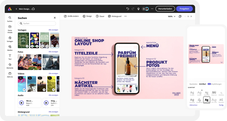 Lade Kolleginnen und Kollegen ganz einfach über einen Freigabelink ein, sich dein Projekt anzusehen, zu kommentieren oder zu bearbeiten. Präsentiere deinen Marketingplan direkt in Adobe Express oder lade ihn als PDF herunter. Mit Adobe Express sind Erstellen, Zusammenarbeit und Teilen deiner Marketingpläne so einfach wie nie zuvor.