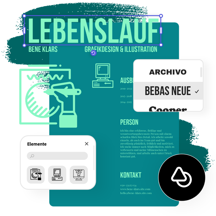 Gestalte einen Lebenslauf, der sich von anderen unterscheidet: Nutze Grafikdesign zu deinem Vorteil. Personalisiere deinen Lebenslauf mit dem endlosen Spektrum an einfachen Design-Tools von Adobe Express. Füge Icons, Rahmen, Trennlinien, Hintergründe und mehr hinzu. Verändere die Farben, die Transparenz und das Layout deiner Grafiken, um den perfekten Lebenslauf zu erstellen. Zum Schluss lädst du über einen Link andere ein, dir Feedback zu geben oder deinen Lebenslauf direkt zu bearbeiten.