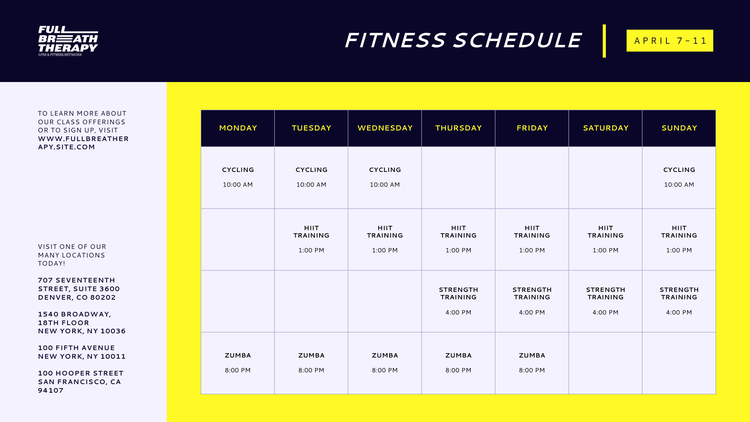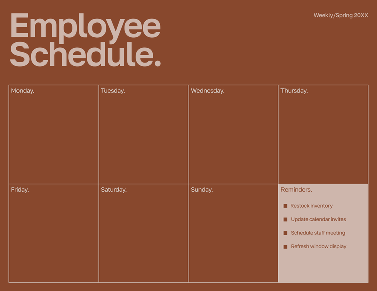 Gestalte einen Plan, der auf deine Arbeitsabläufe abgestimmt ist. Füge feste Daten und Termine hinzu. Und bearbeite deine Programme so, dass sie optisch ansprechend und markenkonform sind. Unsere App zur Erstellung von Zeitplänen enthält viele vorgefertigte Zeitplan-Vorlagen mit allen benötigten Design-Funktionen. Gib einfach deine Daten ein und drucke oder teile deinen Zeitplan.