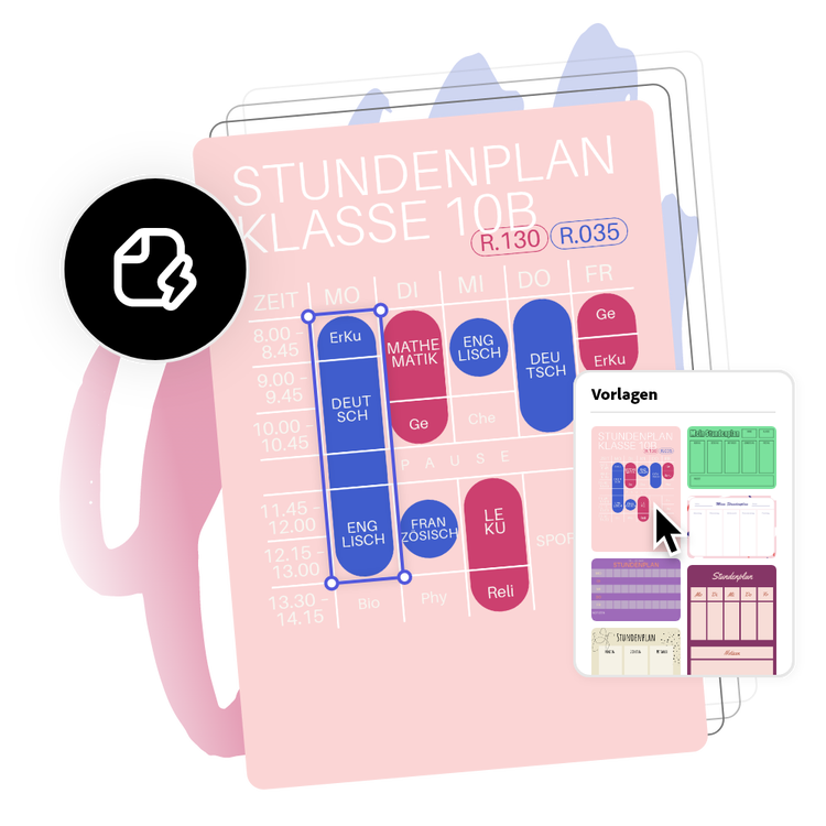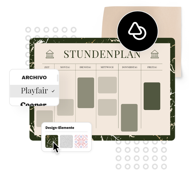 Mithilfe professionell gestalteter Vorlagen verwirklichst du eigene Ideen oder erstellst deinen Unistundenplan von Grund auf neu. Lege ein Thema für deine Entwürfe fest und verwende Fotos, Symbole, Logos, personalisierte Schriftarten und andere individualisierbare Elemente. Dupliziere das Design und passe dessen Größe an, um Einheitlichkeit bei mehreren Arten von Elementen zu gewährleisten. Mit Adobe Express kannst du deine Entwürfe innerhalb weniger Minuten kostenlos und einfach erstellen, speichern und freigeben.