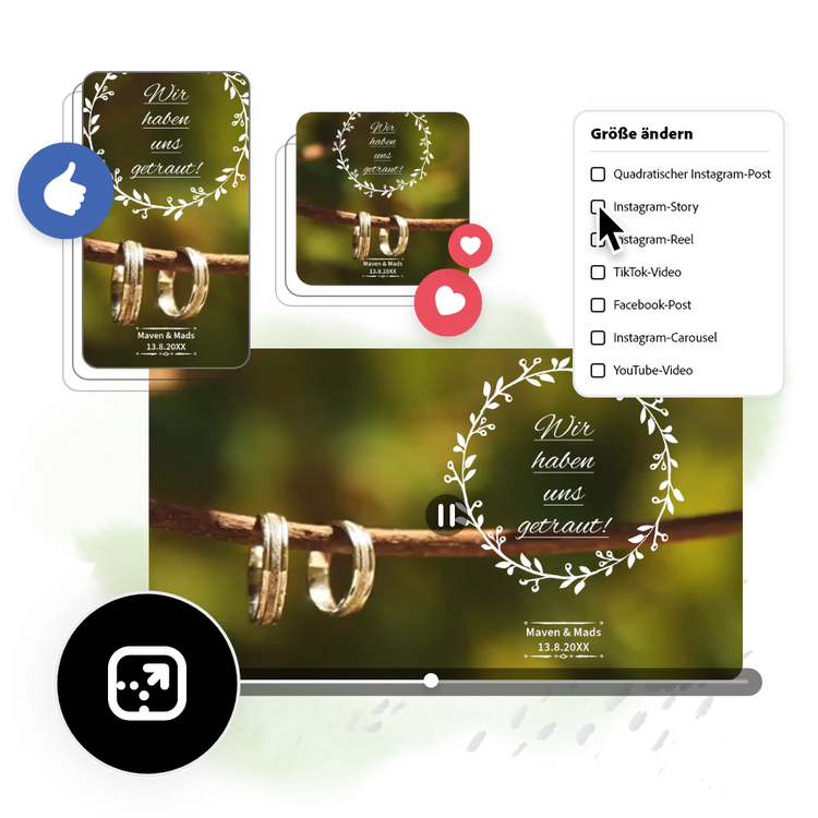 Ein bedeutsames Hochzeitsvideo mit Adobe Express zu erstellen, geht so schnell und einfach, dass es jedem gelingt. Nutze wunderschön gestaltete, kostenlose Video-Vorlagen und starte mit der Videobearbeitung durch. Lade Bilder von deiner Verlobung und Videos von deinem großen Tag hoch und bearbeite sie weiter, indem du sie zuschneidest oder ihnen Filter hinzufügst. Passe direkt die Größe deines fertigen Entwurfs für beliebige digitale Zielplattformen an, und teile dein Hochzeitsvideo mit Freund*innen, Familie und Follower*innen.