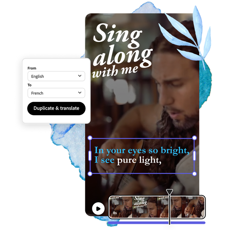 Mit Adobe Express ist es ganz einfach, schöne Lyric-Videos zu erstellen, die deine Musik ergänzen. Egal, ob du als Künstlerin oder Künstler deine neueste Single promotest oder als Pädagogin oder Pädagoge Mitmachlieder für den Unterricht zusammenstellst, Adobe Express bietet dir zahlreiche anpassbare Vorlagen und benutzerfreundliche Werkzeuge zur Videobearbeitung, die dir den Einstieg erleichtern. Lade dein ausgewähltes Lied hoch, füge Bilder hinzu, die den Text ergänzen, schneide die Szenen nach Bedarf zu und personalisiere sie mit Markenelementen wie deinem Logo oder Farbschema. In nur wenigen Minuten hast du ein ansprechendes Textvideo, das die Zuschauer begeistert und zu Likes, Shares und Kommentaren animiert.