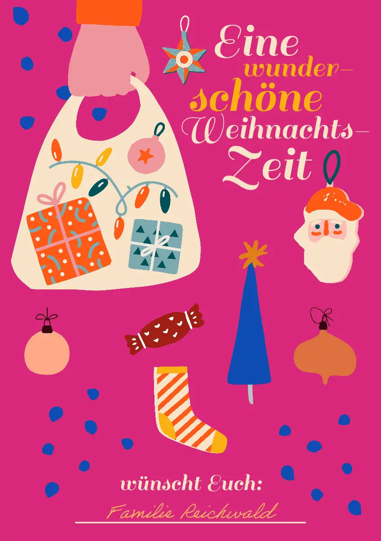 Traditionelle Weihnachtsfarben wie Rot, Grün, Gold und Weiß sorgen für festliche Wärme. Du kannst auch Metallic-Farben, kühle Blautöne oder eine mutige, moderne Farbpalette verwenden – ganz so, dass sie zu deiner Marke passt und dein Design wirklich einzigartig macht.