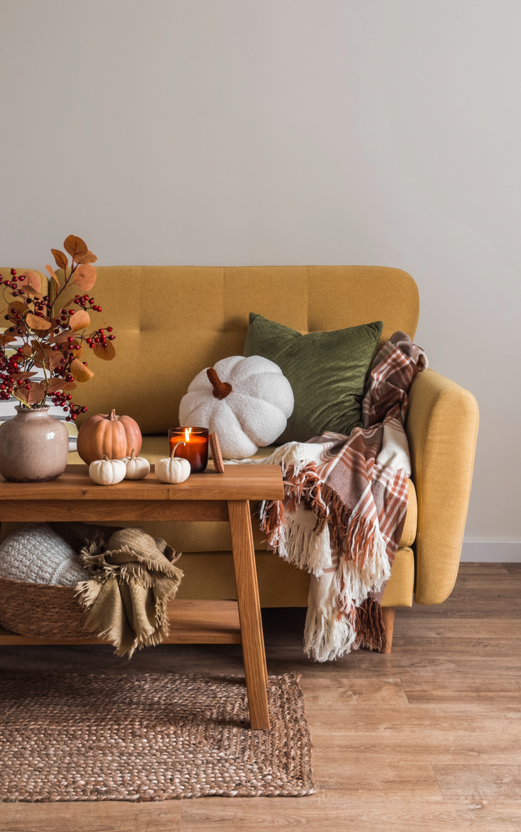 Stelle verschiedene Dekoartikel mit unterschiedlichen Höhen, Strukturen und Farben als Tischdeko in die Mitte deines Couchtischs.