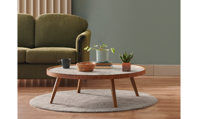 Runde und ovale Tische bieten genügend Platz zwischen Tischkante und Tischdeko und somit flexible Möglichkeiten für die Gestaltung. Schließlich lautet die wichtigste Regel, dass an allen Seiten des Couchtischs genug Platz bleiben muss, um eine Tasse abzustellen.