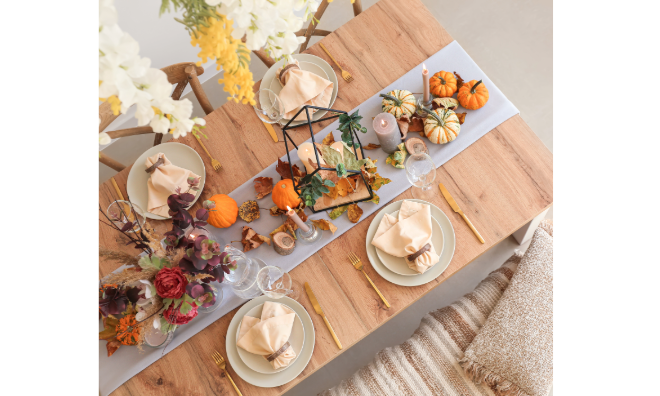 Nimm eine schlichte weiße Tischdecke und einen farbenfrohen Tischläufer – du kannst jedes Muster und jede Farbe auswählen, die dir gefällt –, um einen Kontrast zu schaffen. Füge Teelichter in verschiedenen Gefäßen hinzu, um ein behagliches Flair zu erzeugen. Nimm einfarbige Platzteller und schlichte weiße Teller. Schaffe mit Goldbesteck und bedruckten Papierservietten einen weiteren Kontrast.