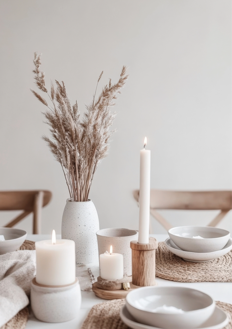 Es gibt viele Möglichkeiten, neutrale Farbpaletten in die Tischdekoration für den Alltag einzubauen. Kombiniere neutrale Platzsets mit Keramiktellern. Nimm Platzteller aus Holz und dazu naturfarbene Teller und Leinenservietten. Stelle ein kleines Arrangement aus Stumpenkerzen oder kleinen Sukkulenten in hübschen Vasen oder Gläsern in die Mitte des Tisches. Schneide Pampasgras und stelle es zusammen mit neutralen Blüten in kleine Keramikvasen.