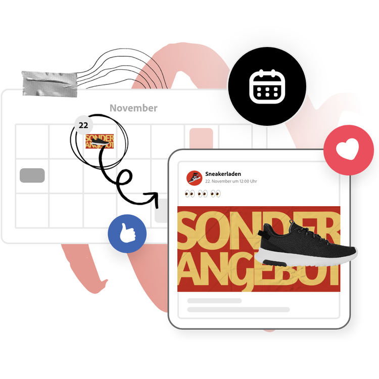 Spare Zeit und lasse deine Marke wachsen mithilfe des Zeitplaners von Adobe Express. Erstelle mit dem kostenlosen Tool „Social Media Planner“ Inhalte, plane deine Beiträge auf TikTok (neu), Instagram, Facebook, X (Twitter), Pinterest und LinkedIn, prüfe sie in der Vorschau und lasse sie automatisch veröffentlichen. Erhältlich als Desktop-Anwendung und als Mobile-App.