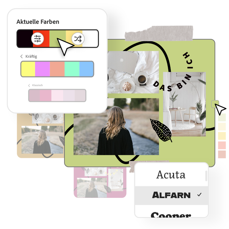 Unzählige lizenzierte Adobe Fonts kannst du direkt in Adobe Express deinen Fotos hinzufügen. Passe die Stimmung deiner Botschaft mit vorgefertigten Farbpaletten an, die von deinem Design inspiriert sind, oder wähle deine eigenen aus. Verfügst du über eigene Marken- oder handverlesene Schriftarten? Lade sie direkt in dein Design hoch, um sie zu nutzen.