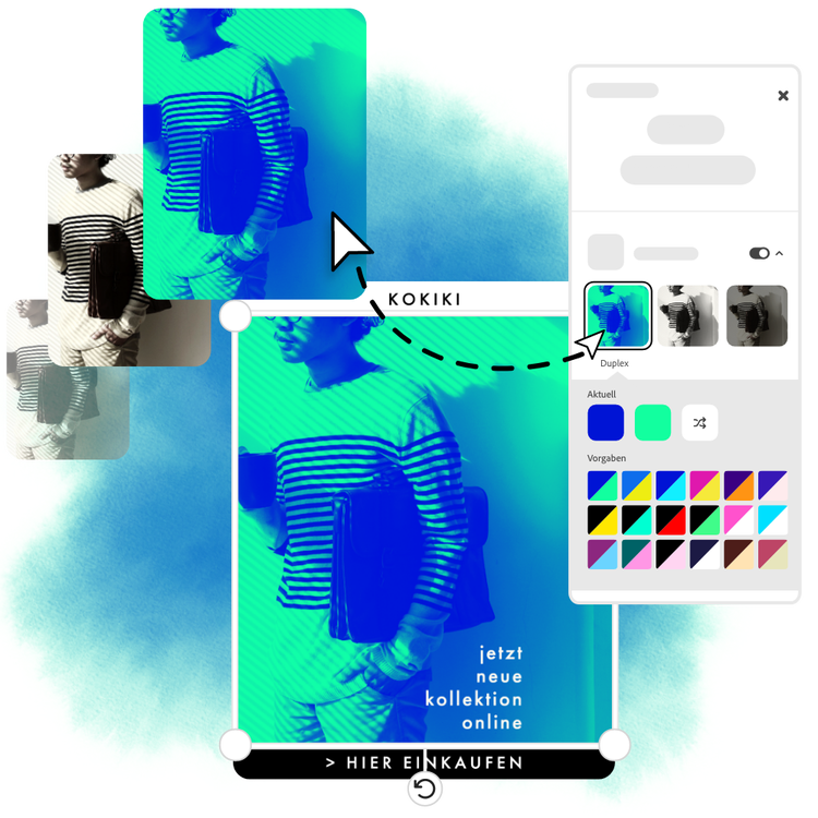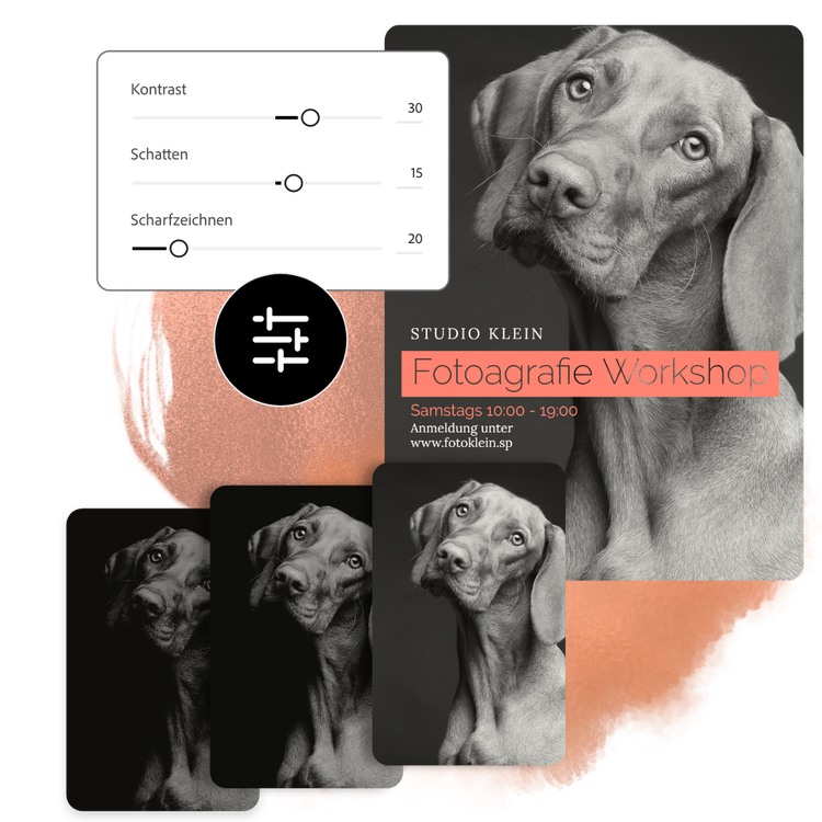 Verwandle dein neu bearbeitetes Bild in einen überzeugenden Flyer, einen Social-Media-Beitrag, ein Cover, ein Profilfoto und viele weitere Designs. Durchstöbere zunächst unsere Vorlagen-Bibliothek. Füge dann weitere vorinstallierte Designelemente, Schriftarten, Icons oder GIFs hinzu, um dein Bild zu personalisieren. Es gibt unendlich viele kreative Möglichkeiten, dein Design zu optimieren.