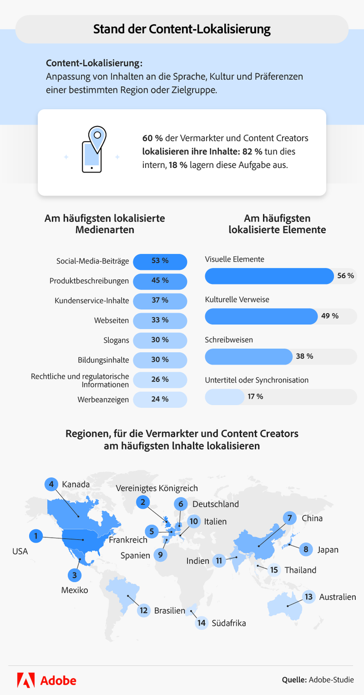 Mehr als die Hälfte der Vermarkter und Content Creators (60 %) hat bereits Inhalte lokalisiert, wobei 82 % den Prozess intern durchführen und 18 % ihn auslagern. Die am häufigsten lokalisierten Arten von Inhalten waren Social-Media-Beiträge, Produktbeschreibungen und Kundenservice-Inhalte.