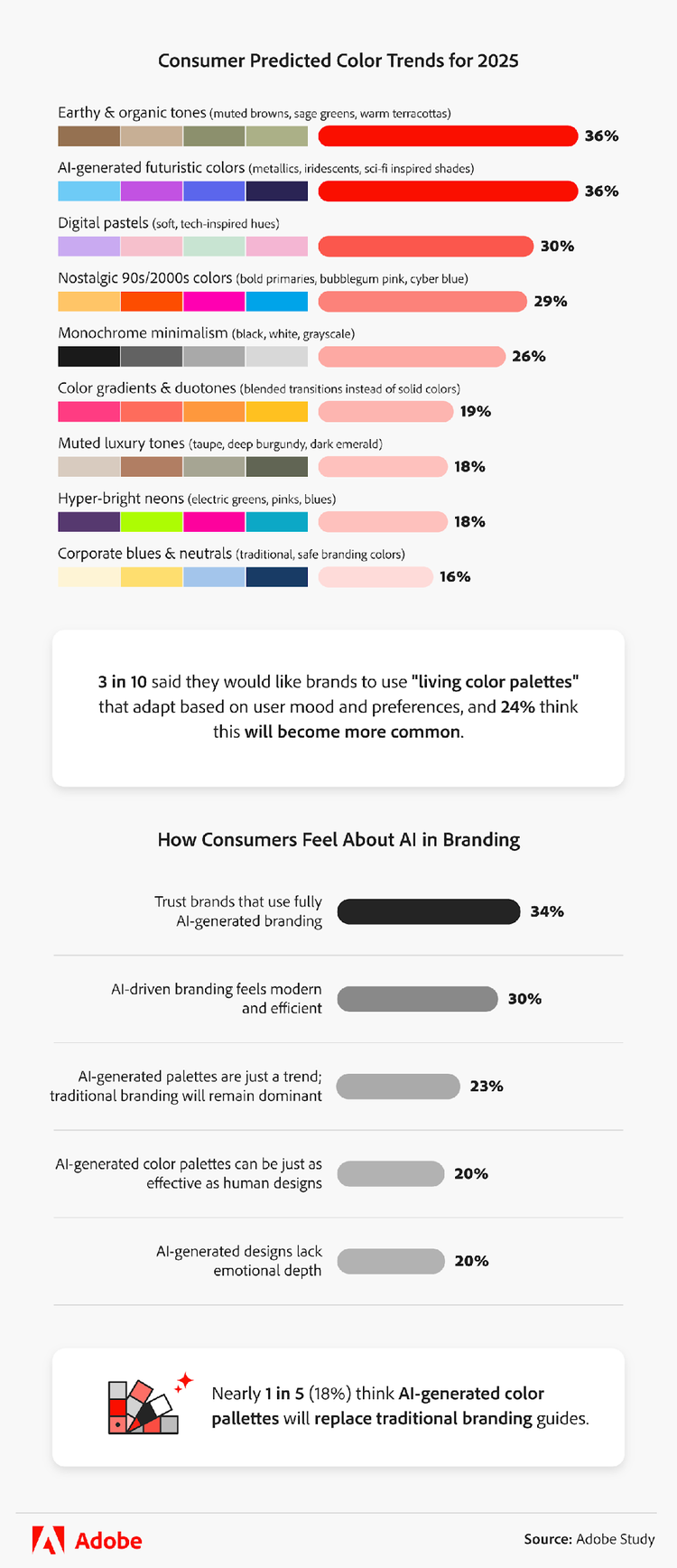 Über ein Drittel der Verbraucherinnen und Verbraucher (36 %) gehen der Umfrage zufolge davon aus, dass zwei ganz unterschiedliche Stile das Branding 2025 dominieren werden: erdige, organische Töne wie gedeckte Brauntöne, Salbeigrün und Terrakotta sowie futuristische KI-generierte Farben wie Metallic-, schillernde und von Science-Fiction inspirierte Farbtöne. Dieser Kontrast spiegelt das wachsende Interesse sowohl an natürlicher Authentizität als auch an technologischer Neuerung wider.