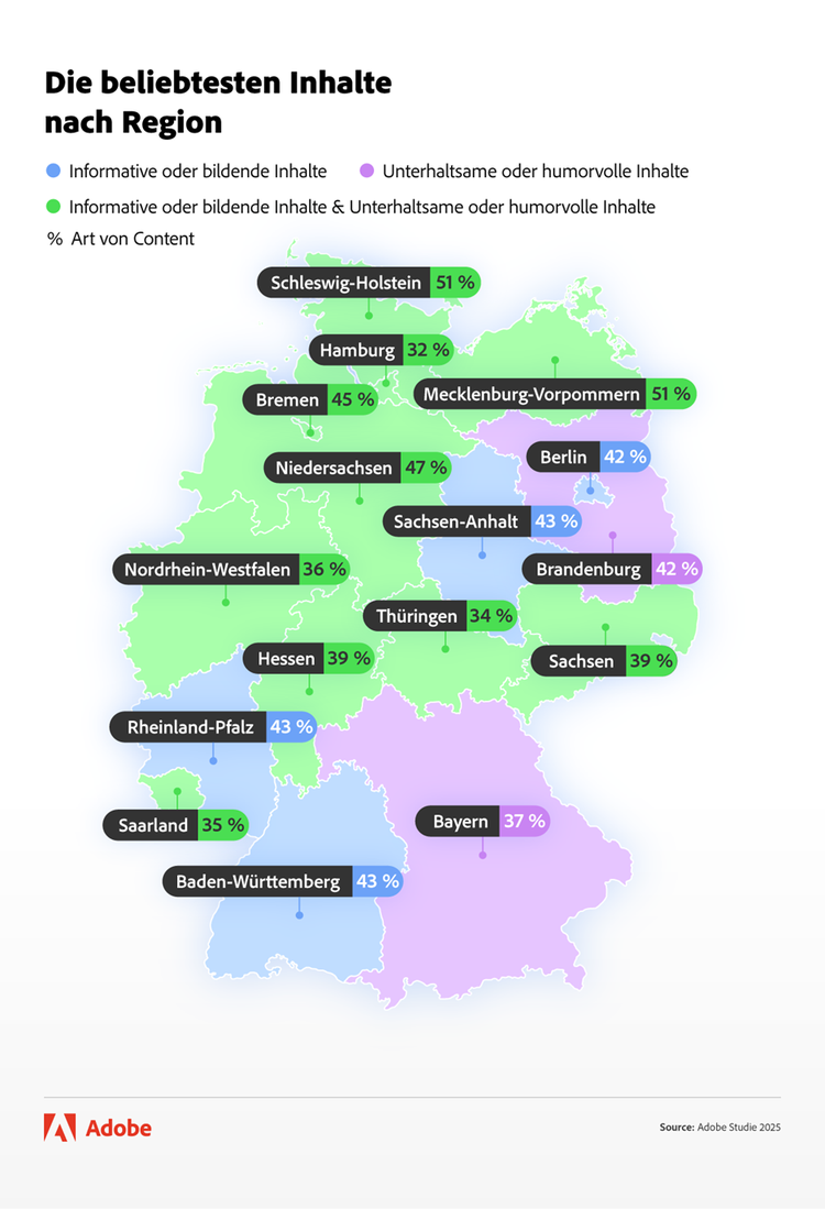 Aus regionaler Sicht sind die Bewohner Mecklenburg-Vorpommerns große Fans von Kurz-Content (40 %). Das Saarland hatte hier mit nur 22 % die niedrigste Beteiligung. Die Bremer zeigen das größte Interesse an Nachrichten (31 %) und die Brandenburger sind mit 14 % am meisten an KI interessiert.