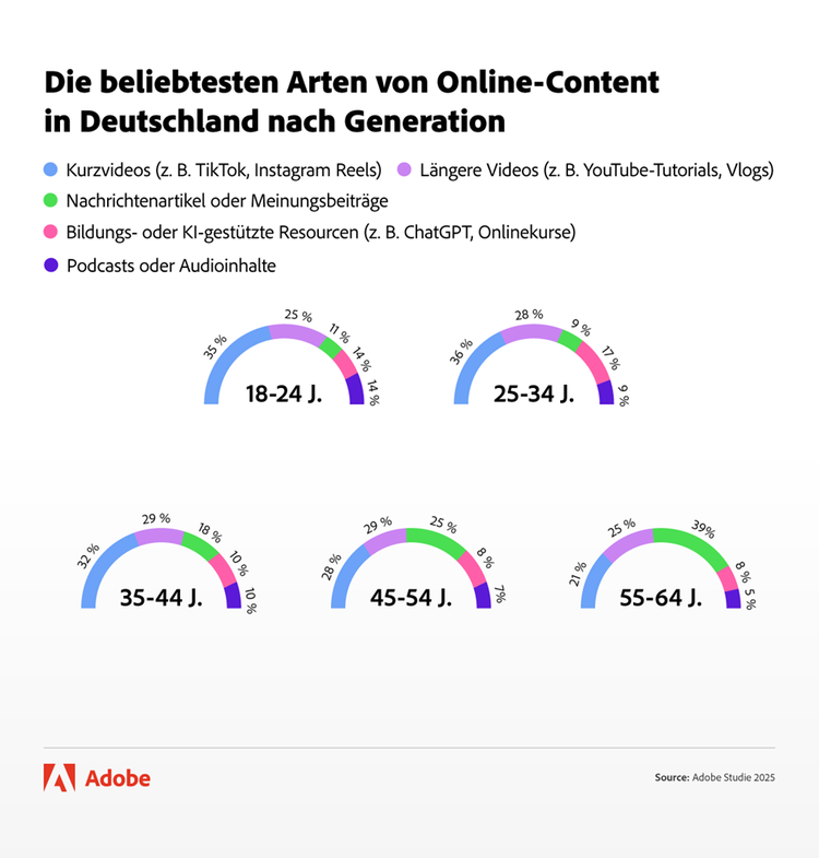 Falls es bis jetzt noch nicht klar war: Kurz-Content und neue Plattformen sind für Millennials und die Gen Z weiterhin führend, während ältere Generationen Inhalte bevorzugen, die langsamer getaktet sind und bei denen Video-Content nicht im Vordergrund steht.