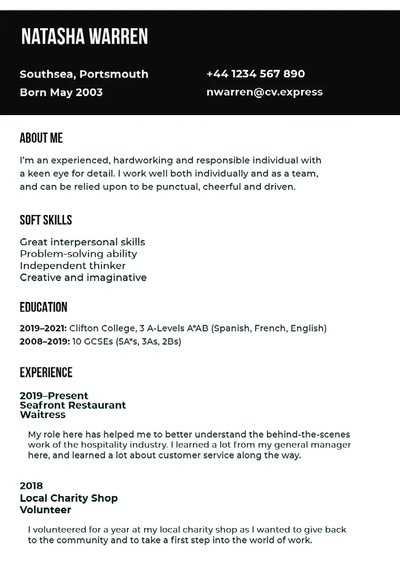 - Persönliche Informationen: Beginne mit deinem Namen, deiner Adresse sowie Telefonnummer und füge auch deine E-Mail-Adresse ein. Selbst wenn du deinen Lebenslauf per Mail verschickst – so hast du alle wichtigen Kontaktinformationen an einem Ort. Dein Geburtsdatum gehört nicht in einen englischen Lebenslauf. Nur wenn du dich für einen Job mit einem Mindestalter bewirbst, ist es ratsam, dein Geburtsdatum mit anzugeben.