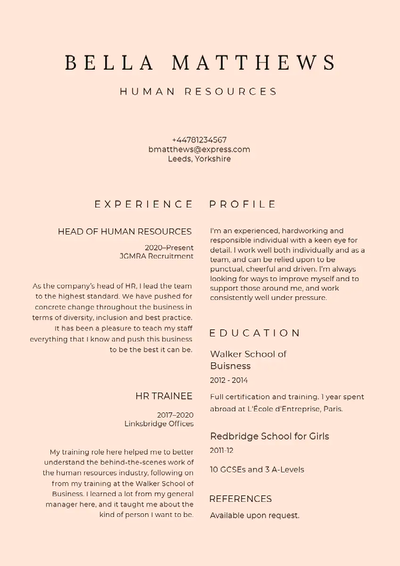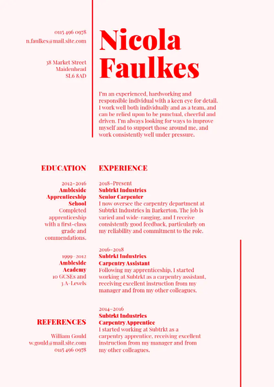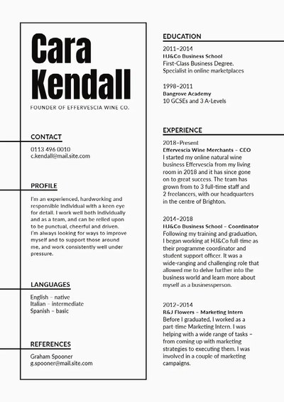 - Minimalistisches Lebenslauf-Design: Bei den meisten Lebensläufen steht der Inhalt im Fokus, nicht das Design – außer bei einer Stelle mit Schwerpunkt Design. Entscheide dich daher für ein sauberes, minimalistisches Lebenslauf-Design mit Schwerpunkt auf dem Inhalt. Vermeide weitestgehend Bilder, Grafiken oder andere Formen der Ablenkung und achte darauf, dass genügend Leerraum vorhanden ist, damit dein englischer Lebenslauf optisch ansprechend und gut lesbar ist.