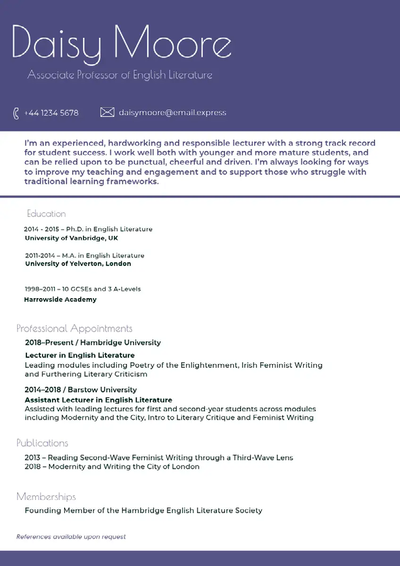 - Einheitliche Formatierung: Verwende ein sauberes und professionelles Format für den „English CV“ und nutze einheitliche Schriftarten. Die Schriftart sollte nicht verspielt, sondern einfach und seriös sein. Füge den einzelnen Abschnitten zur besseren Orientierung Überschriften hinzu. Achte grundsätzlich darauf, dass dein englischer Lebenslauf übersichtlich gegliedert und leicht zu lesen ist.