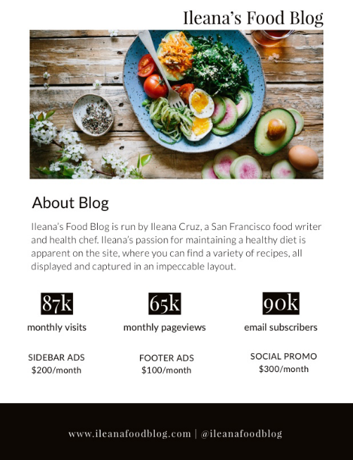 Am wichtigsten ist, dass es Informationen über die Besucherzahlen deines Blogs, dein Following auf Social Media, die Größe deiner E-Mail-Liste und andere relevante (und beeindruckende) Details enthält. Diese Metriken werden Geschäftsinhaber*innen definitiv davon überzeugen, mit dir zusammenzuarbeiten.