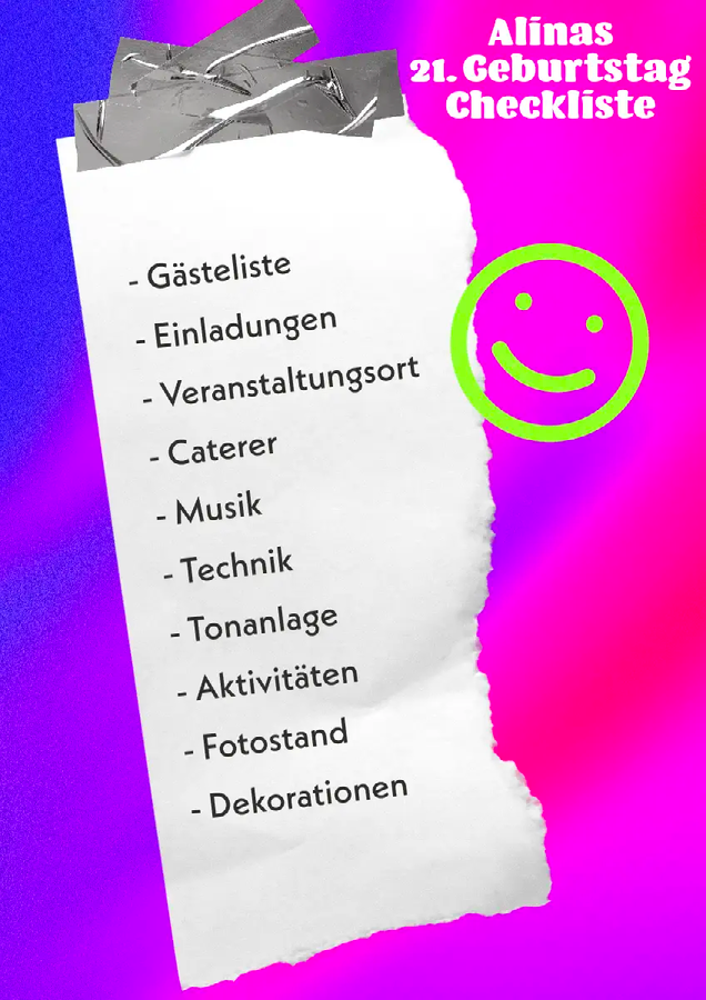 Du kannst ganz einfach eine Geburtstagsfeier planen, indem du dir vorher eine Checkliste erstellst. Hier sind ein paar Vorschläge: