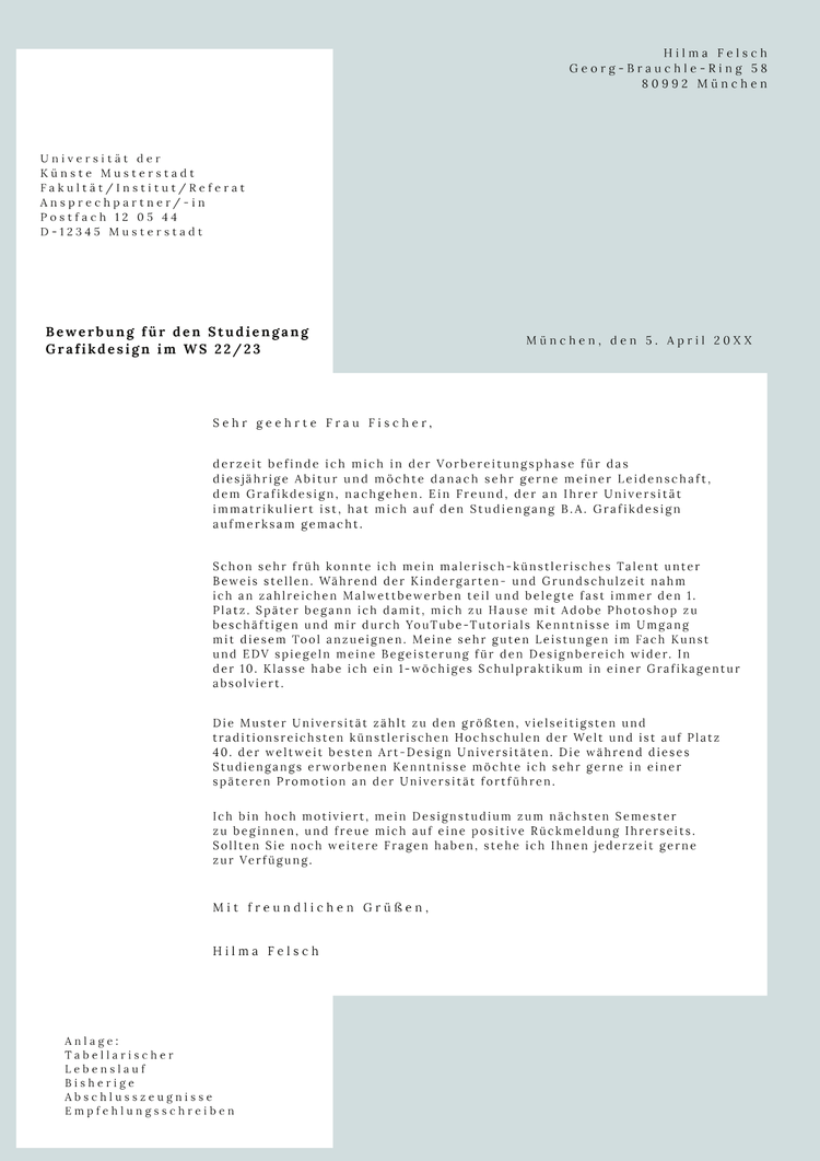 Die ideale Länge eines Bewerbungsschreibens liegt zwischen einer halben und einer ganzen DIN-A4-Seite. Formuliere deinen Text kurz und treffend, um die Aufmerksamkeit der angesprochenen Person zu gewinnen.