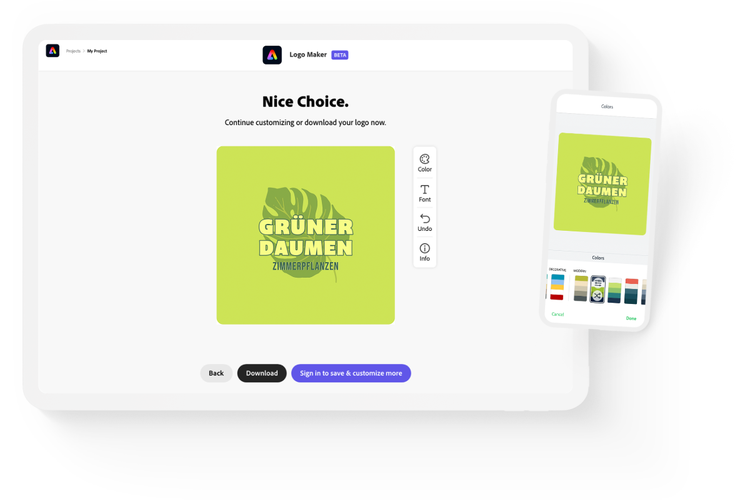 Sobald das Design deines Logos fertig ist, veröffentliche und teile es. Adobe Express speichert deine Logo-Ideen, sodass du jeder Zeit immer wieder auf dein Projekt zugreifen kannst, wenn du es zu einem späteren Zeitpunkt aktualisieren möchtest.