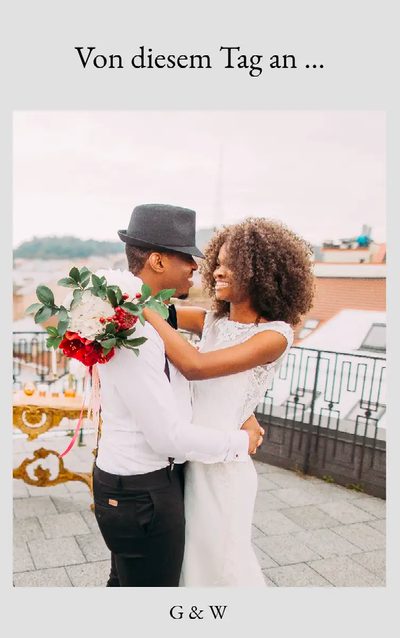 - "Heute beginnt euer gemeinsames Abenteuer – möge es voller Glück, Lachen und unvergesslicher Momente sein. Herzlichen Glückwunsch zur Hochzeit!”