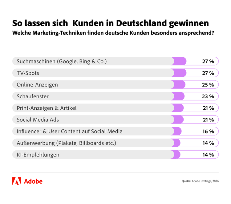 Vor diesem Hintergrund hat Adobe Express 2.000 Erwachsene, die in Deutschland leben, befragt und herausgefunden, was Käufer dazu bewegt, sich für einen bestimmten Kanal zu entscheiden und warum sie dorthin zurückkehren würden. Dabei wurde verschiedenes untersucht: von den sich ändernden Präferenzen bis hin zu den effektivsten Marketingstrategien sowie die Erwartungen an die Entwicklung von Marken im Jahr 2026.