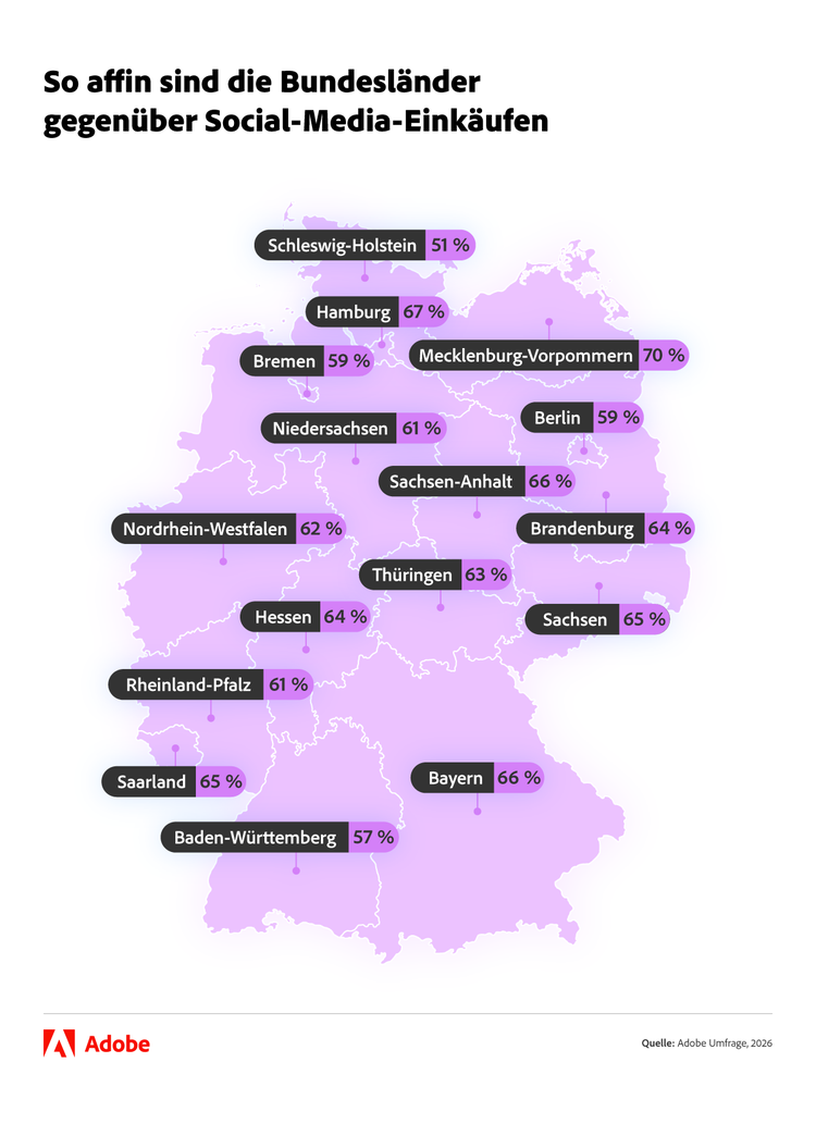 Auf regionaler Ebene fällt das Saarland besonders auf: 22 % der Befragten dort finden, dass Social-Media-Plattformen hochwertige Produkte anbieten. In Sachsen-Anhalt hingegen sind die Bewertungen weniger positiv – nur 4 % stimmen dieser Einschätzung zu.