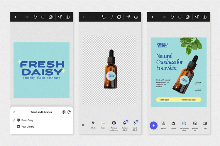 Stelle dir zum Beispiel vor, eine angehende Unternehmerin startet ihre selbstgemachte Hautpflegelinie direkt vom Küchentisch aus. Ihre Produkte sind top, aber leider hat sie keine Ahnung von Design. Mit Adobe Express kann sie ein Logo erstellen, Flyer gestalten, Vorlagen für Social Media bauen und sogar Produktetiketten kreiren – alles direkt vom Handy aus. Jetzt kann sie ihre Produkte auf Etsy verkaufen und parallel eine treue Community auf Instagram aufbauen. Ihr Geheimrezept ist intelligentes Design – das hat ihr von Anfang an einen professionellen Auftritt verschafft.