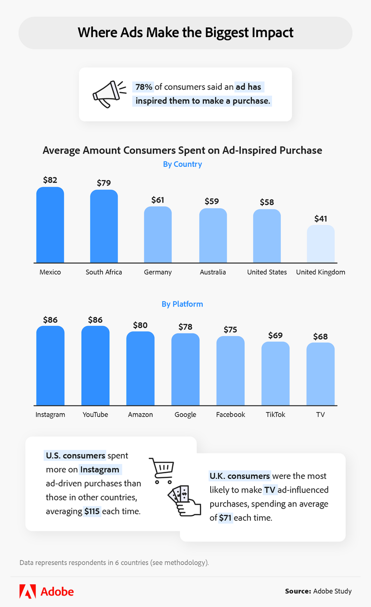 Betrachtet man die Ausgaben der Verbraucherinnen und Verbraucher in verschiedenen Teilen der Welt, so geben Mexiko (82 USD) und Südafrika (79 USD) im Durchschnitt deutlich mehr für durch Werbung inspirierte Käufe aus als andere Länder wie Deutschland (61 USD), Australien (59 USD), die USA (58 USD) und Großbritannien (41 USD).