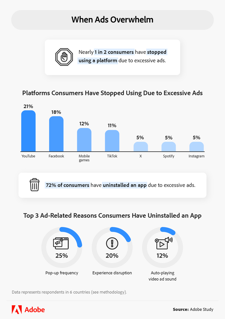 Fast die Hälfte der Verbraucherinnen und Verbraucher weltweit gab an, eine Plattform wegen übermäßiger Werbung verlassen zu haben. YouTube war der Hauptgrund für diesen Exodus. 21 % der Nutzerinnen und Nutzer verließen die Plattform wegen zu viel Werbung, besonders häufig in Mexiko (29 %). Einige Befragte trennten sich wegen übermäßiger Werbung auch von Facebook (18 %), insbesondere im Vereinigten Königreich, wo ein Viertel dies bestätigte.